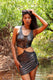 This eye-catching two-piece dress features a daring leopard print in shimmering black, gray, and silver tones, exuding a bold, metallic sheen. The crop top is sleeveless with thin straps and a scooped neckline, showcasing a striking lace-up detail at the front that reveals a hint of skin underneath. The back of the top is equally dramatic, with crisscross black lacing that ties at the bottom, creating an open-back design. One circular metal ring connect the top to the skirt, adding a modern edge. The high-waisted skirt is form-fitting with a ruched texture, hugging the body and ending mid-thigh for a flirty, mini-dress silhouette. Perfect for a night out or festival, this set combines fierce style with a confident, contemporary vibe.